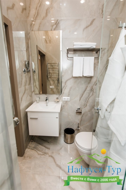 с душем, тапочки, туалетные принадлежности, фен, халат