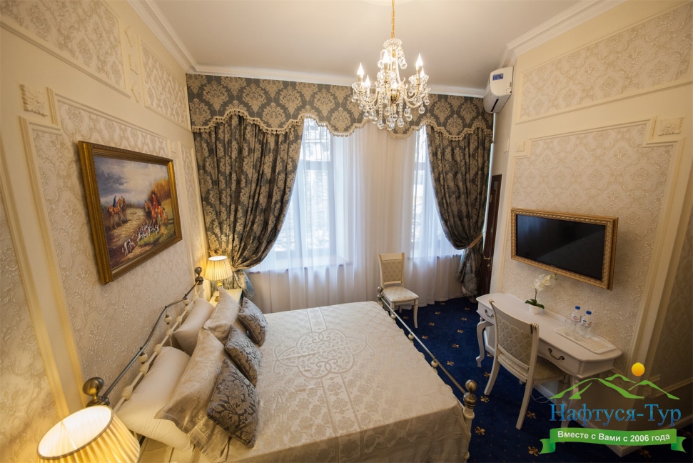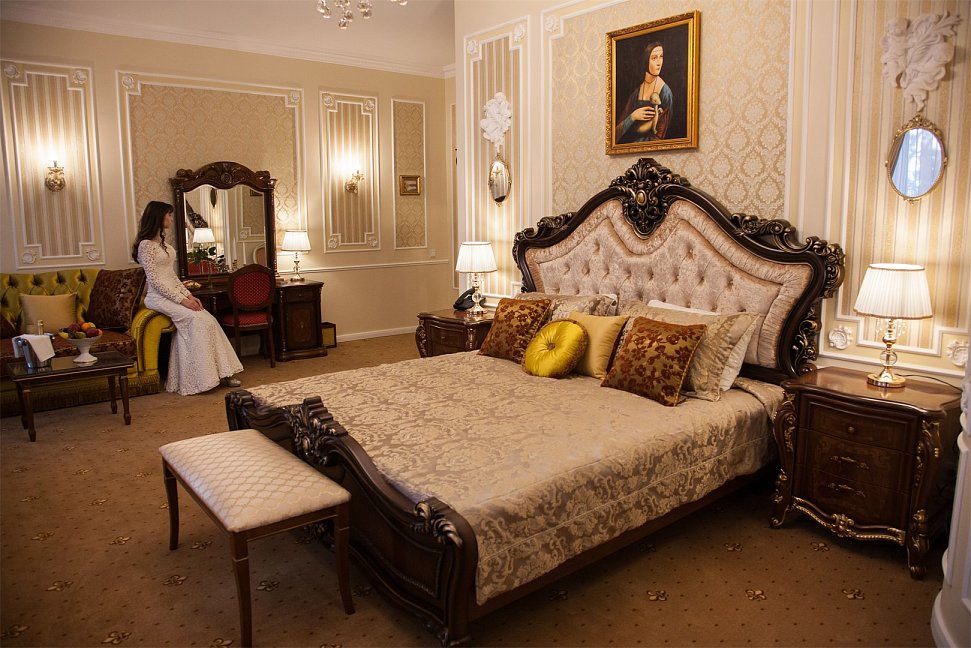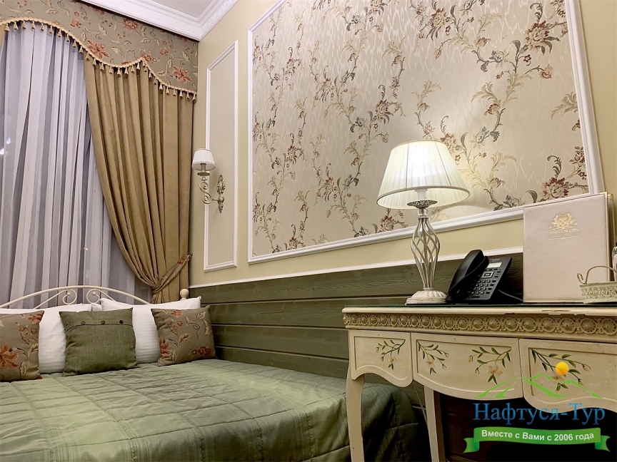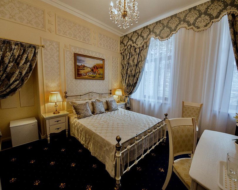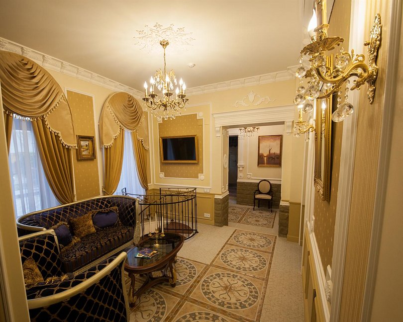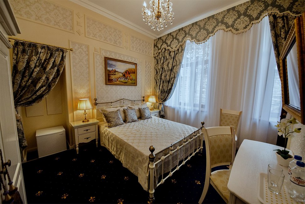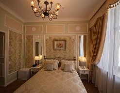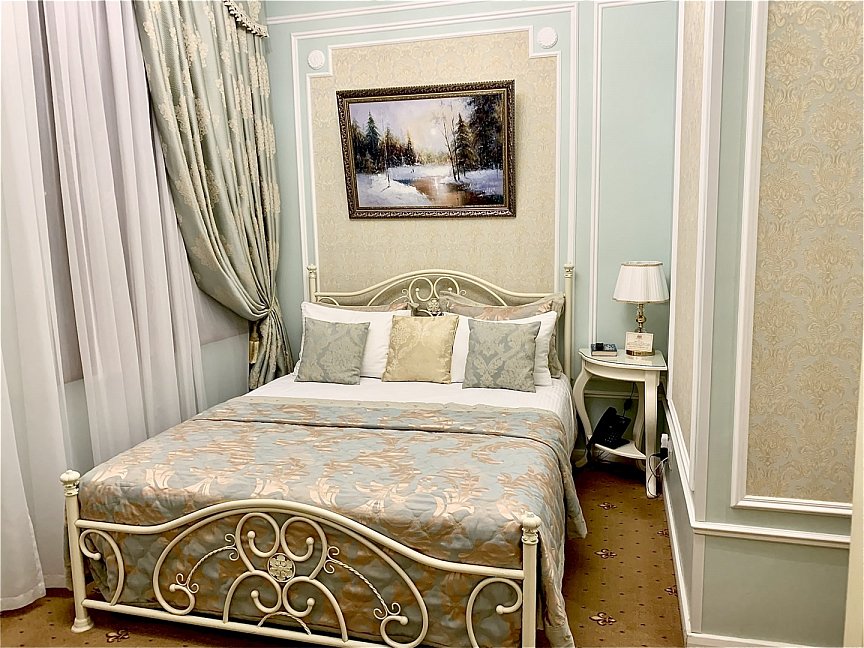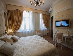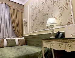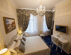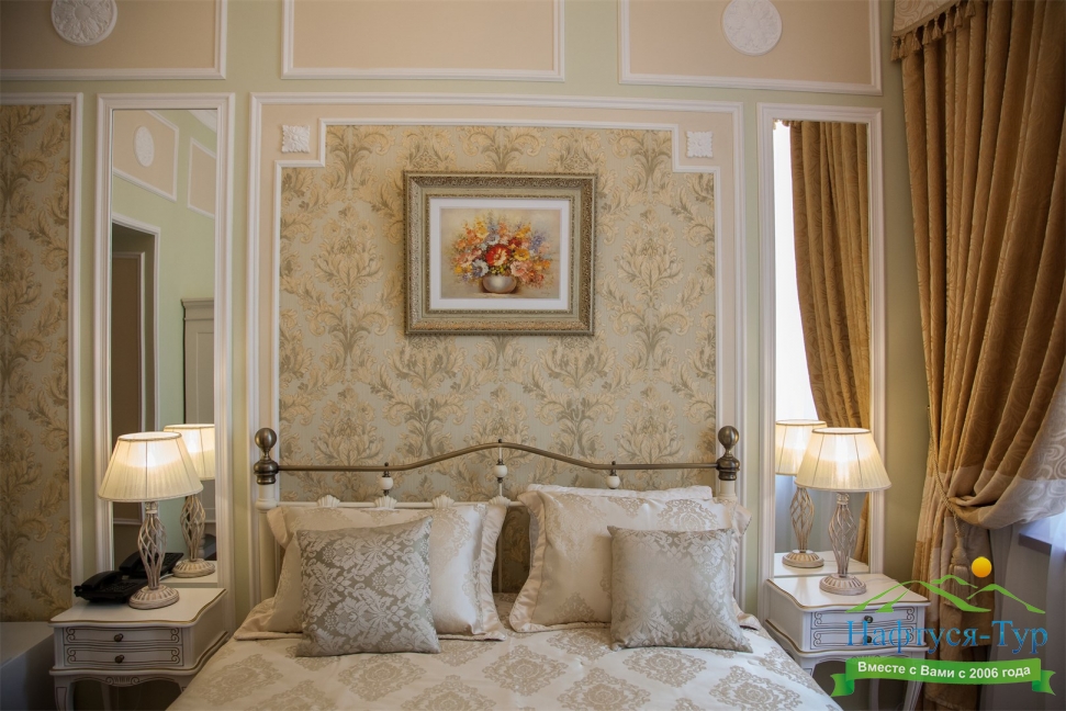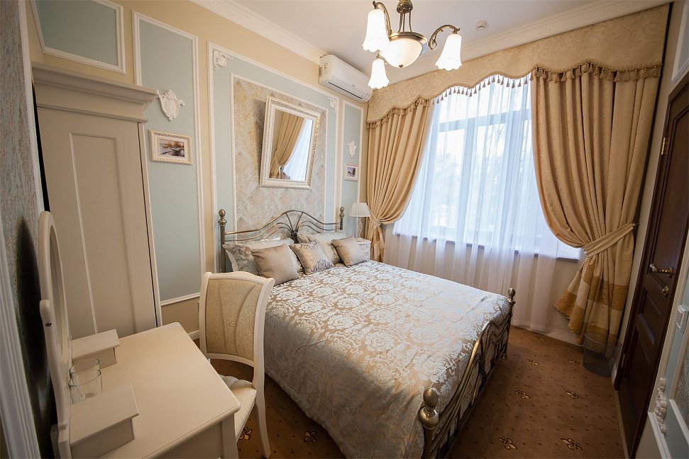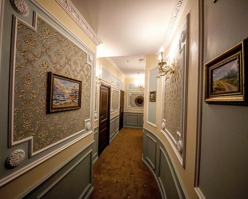 - номера отеля оформлены в индивидуальном дизайне с элементами лепнины в классическом стиле дореволюционной России