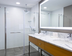 с ванной и душевой кабиной, тапочки, туалетные принадлежности, фен, халат