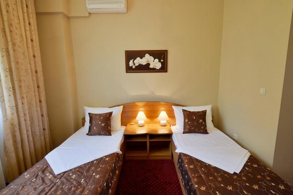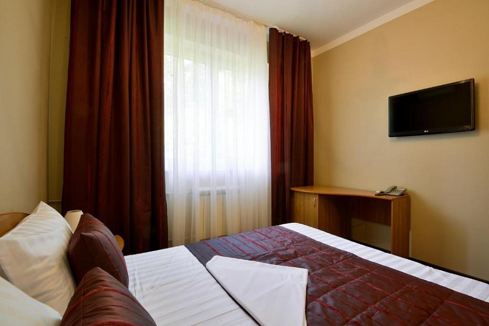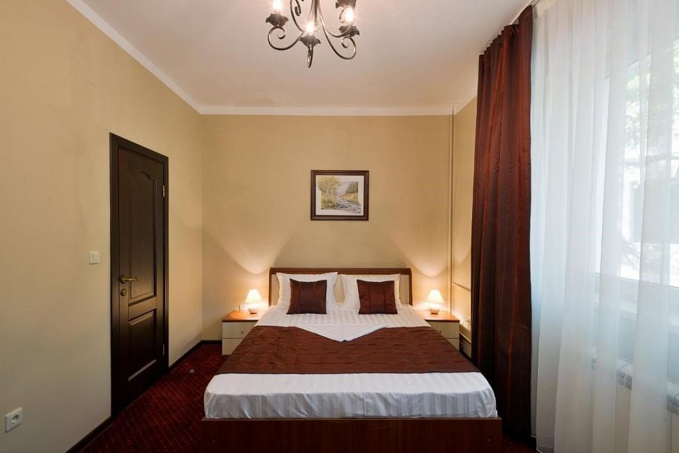 Самолетом до аэропорта Адлер, далее на автобусе №105, 105с до остановки «Центральный военный санаторий имени Ворошилова». Пройти 130 м до отеля.