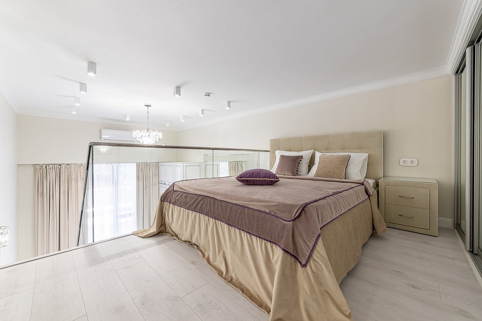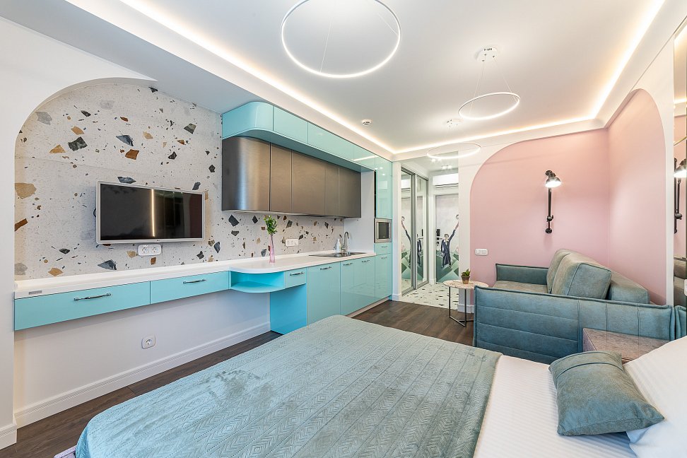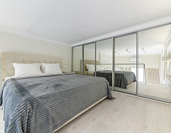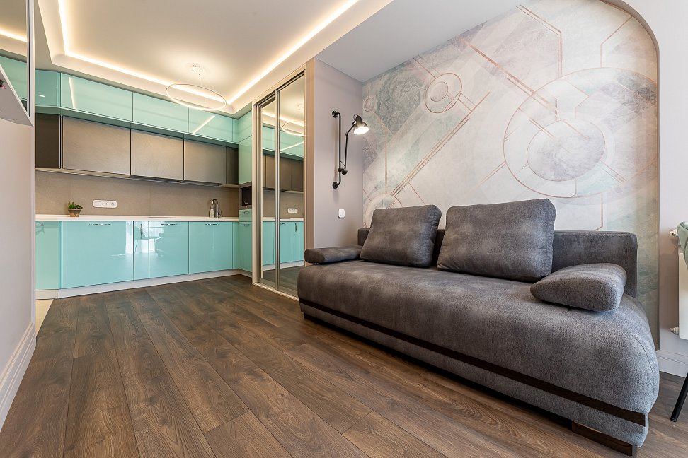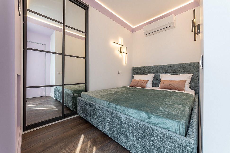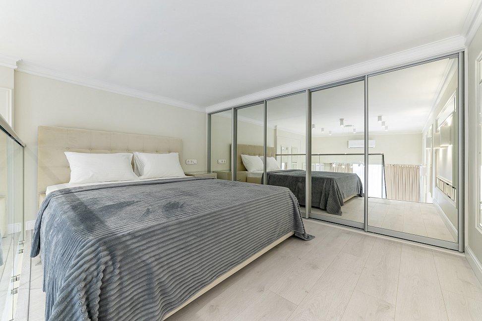 вешалка, диван раскладной, кровать двуспальная, кухонная мебель, прикроватные тумбочки, шкаф встроенный