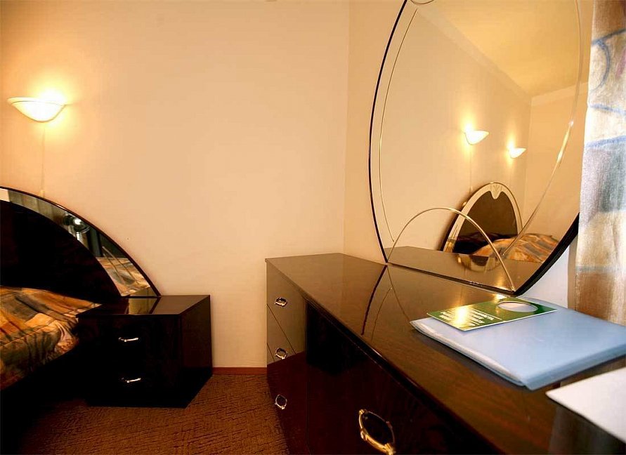 зеркало, кровати односпальные /одна двуспальная кровать, прикроватные тумбочки, стол, стул, шкаф