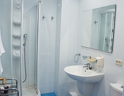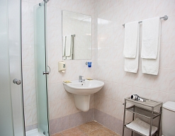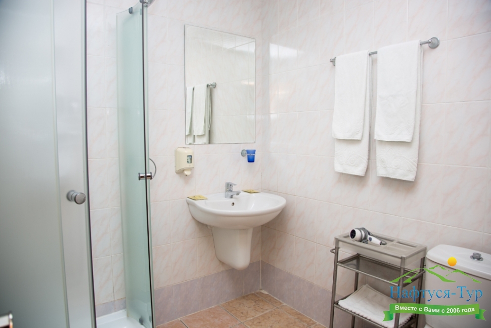 с душевой кабиной, туалетные принадлежности, фен