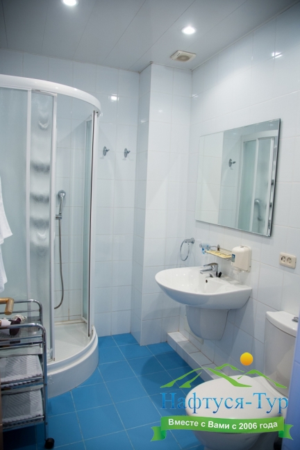 с душевой кабиной, тапочки, туалетные принадлежности, фен, халат