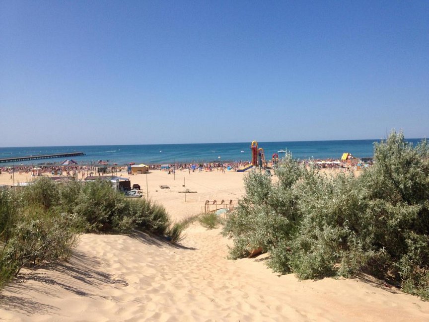 Оборудованный навесами и лежаками песчаный поселковый пляж находится в 600 метрах от отеля
