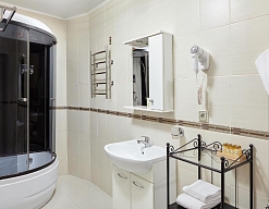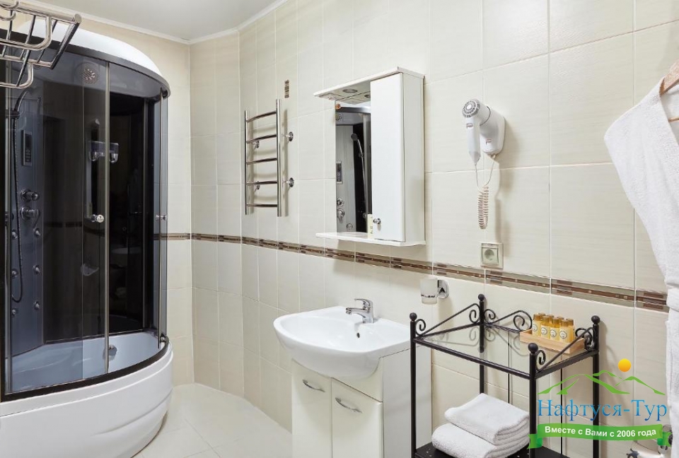 с душевой кабиной, туалетные принадлежности, фен