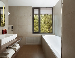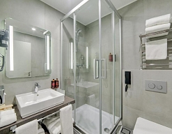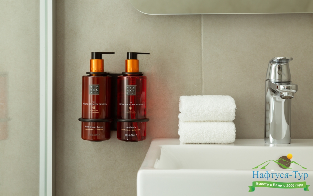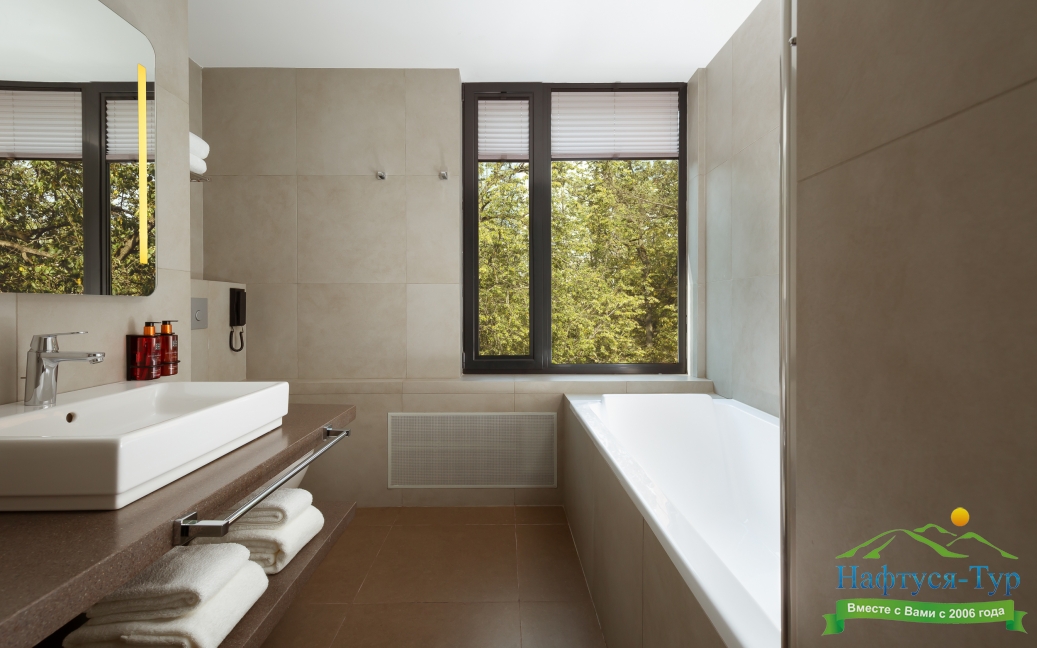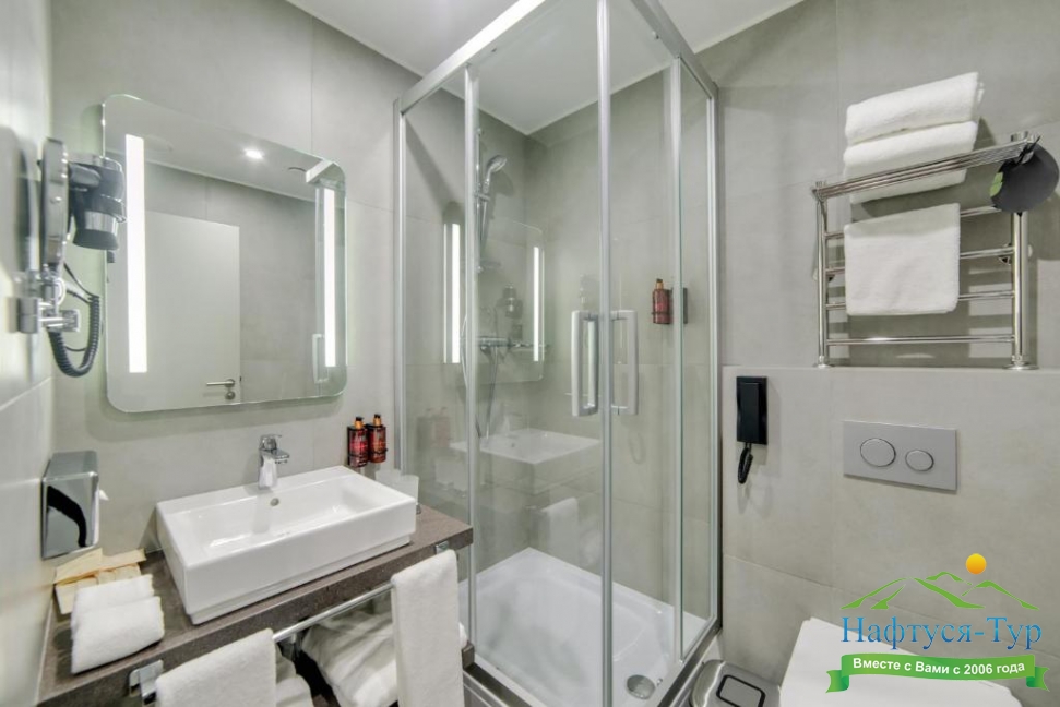 с ванной/душем, тапочки, туалетные принадлежности, фен, халат