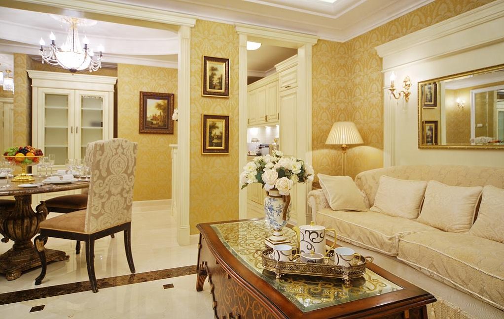 кухня, диван, зеркало, кровати односпальные /одна двуспальная кровать, прикроватные тумбочки, стол, стулья, тумба, шкаф