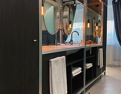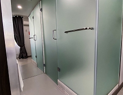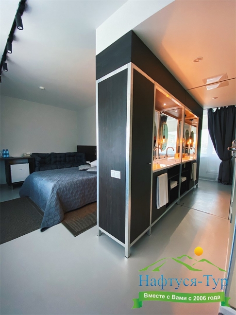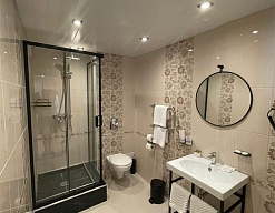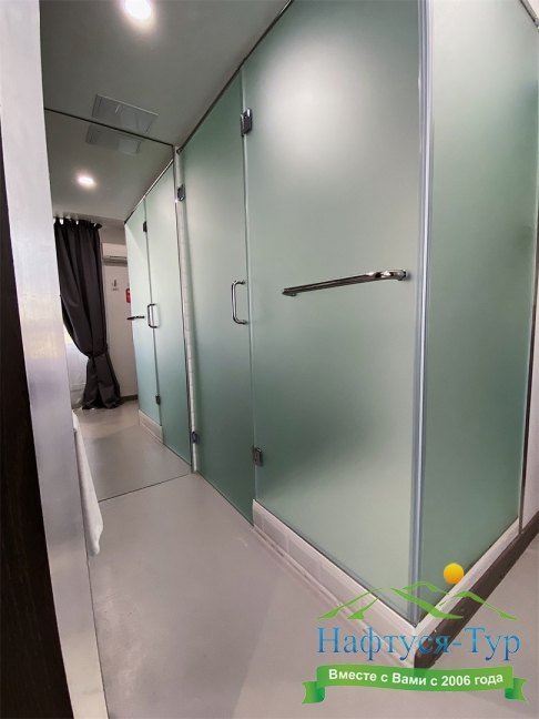 с душевой кабиной, тапочки, туалетные принадлежности, фен