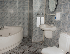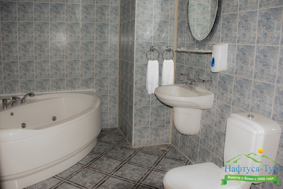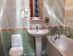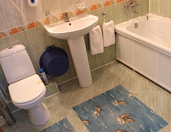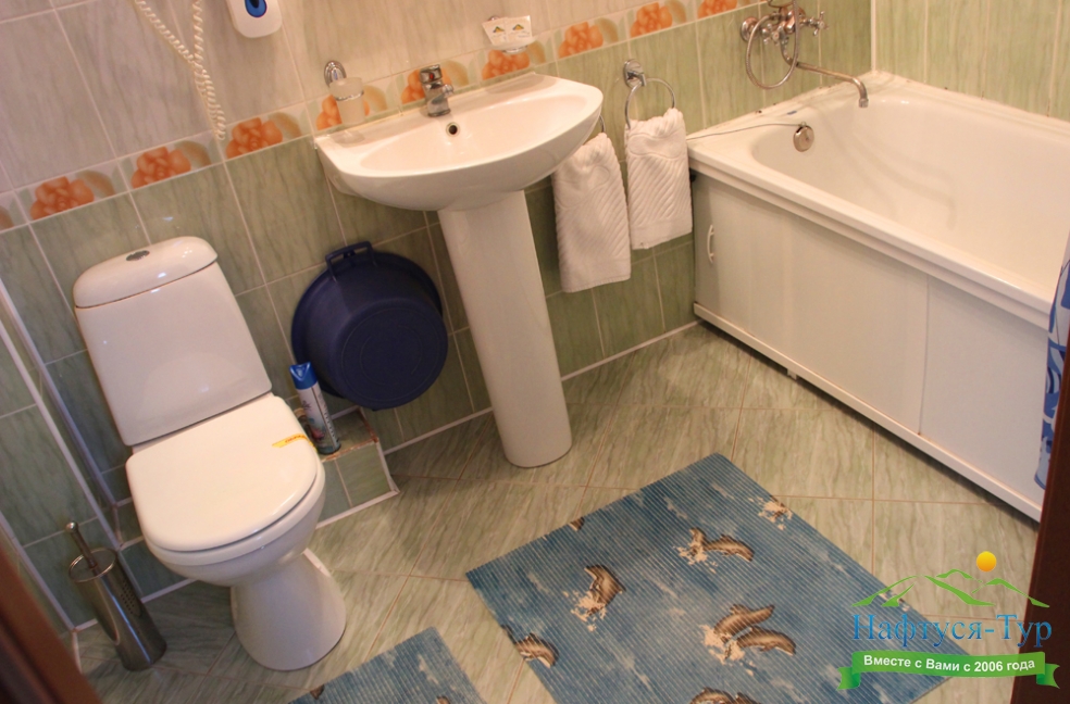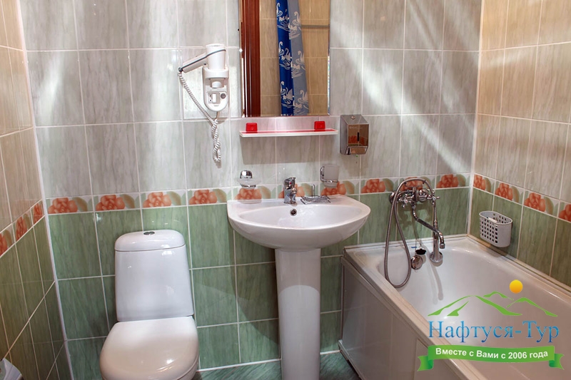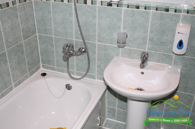 с ванной, тапочки, туалетные принадлежности, фен, халат