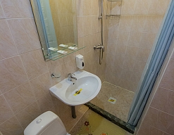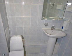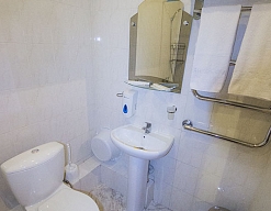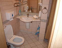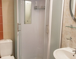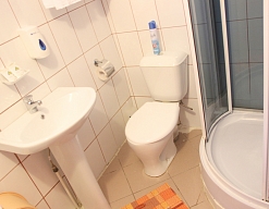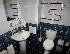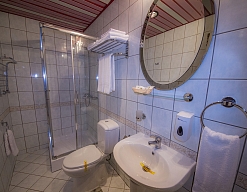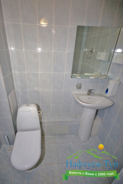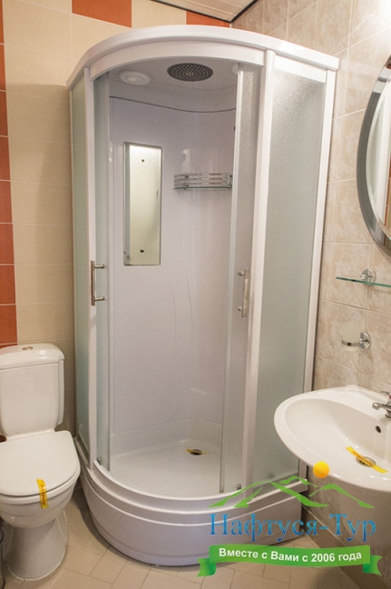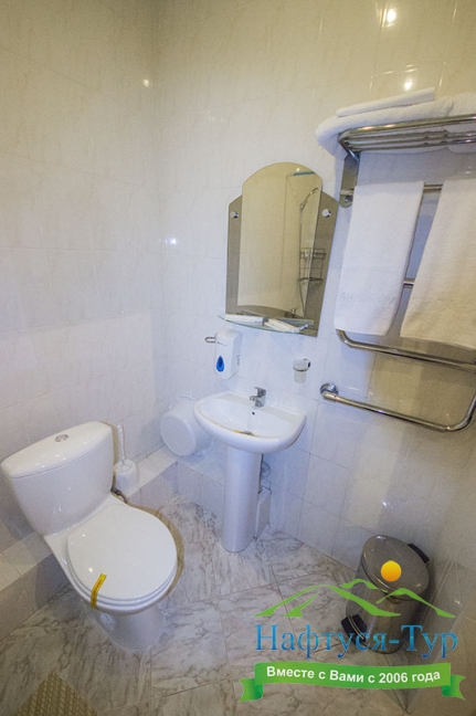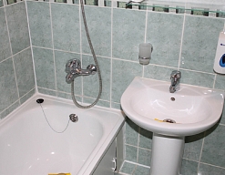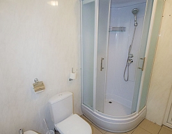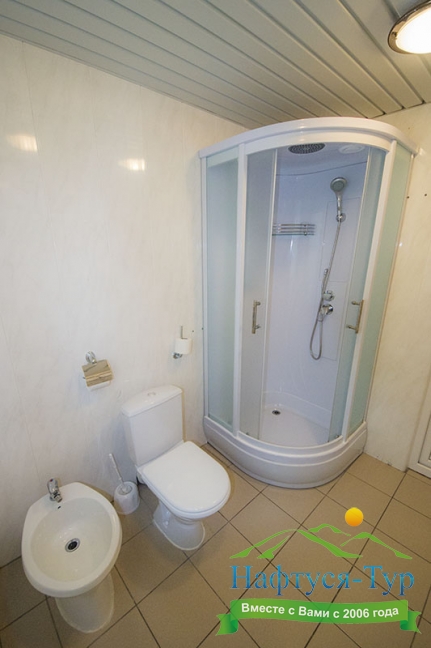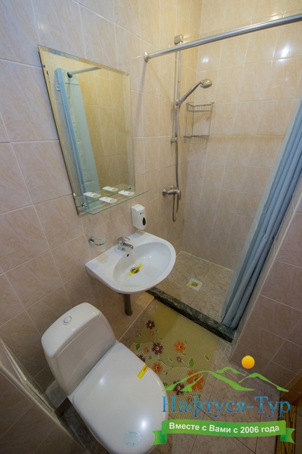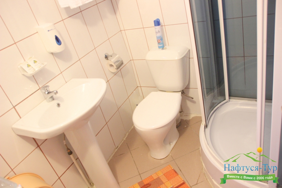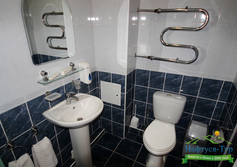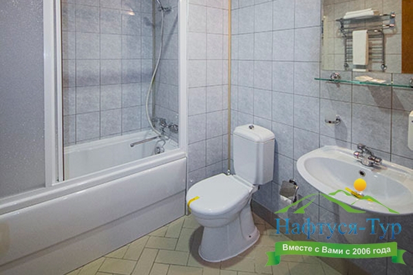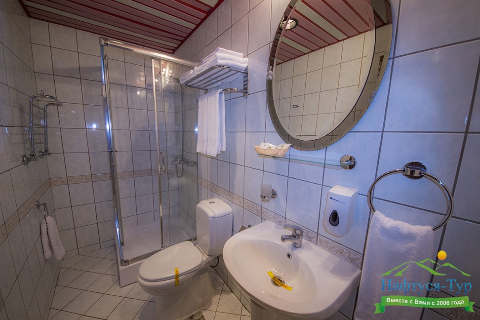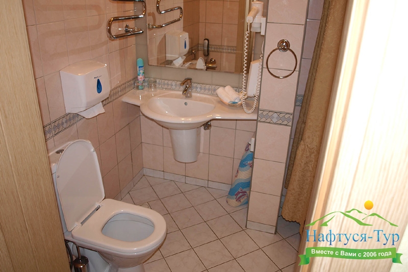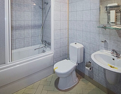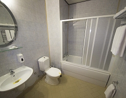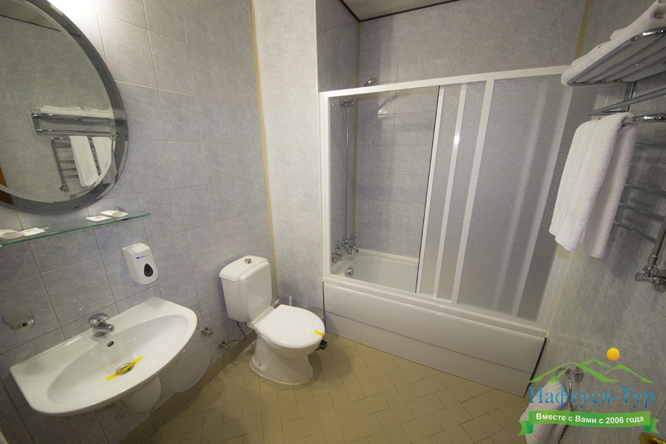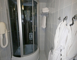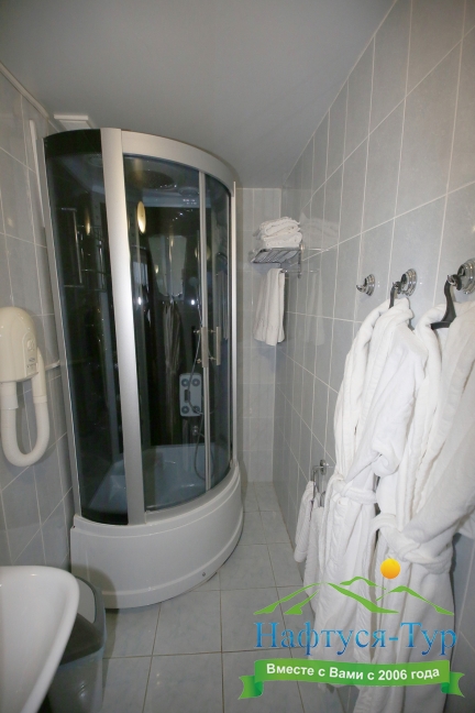 с ванной или душевой кабиной, тапочки, туалетные принадлежности, фен, халат