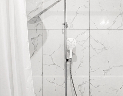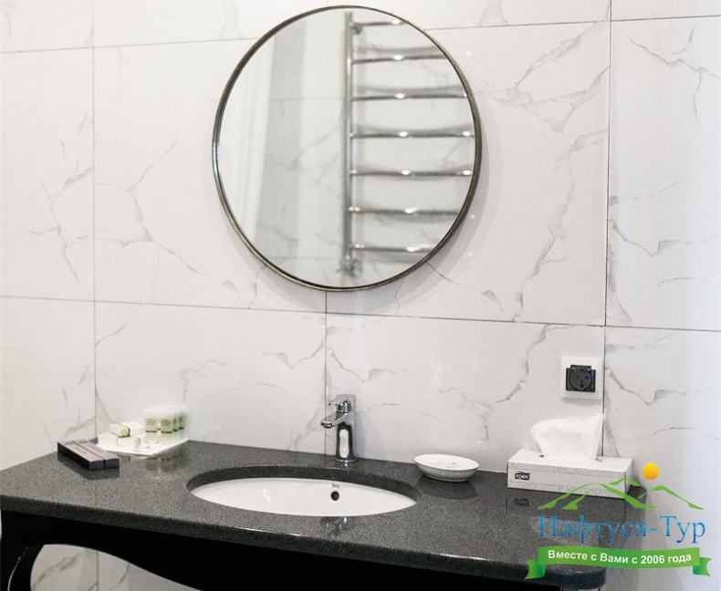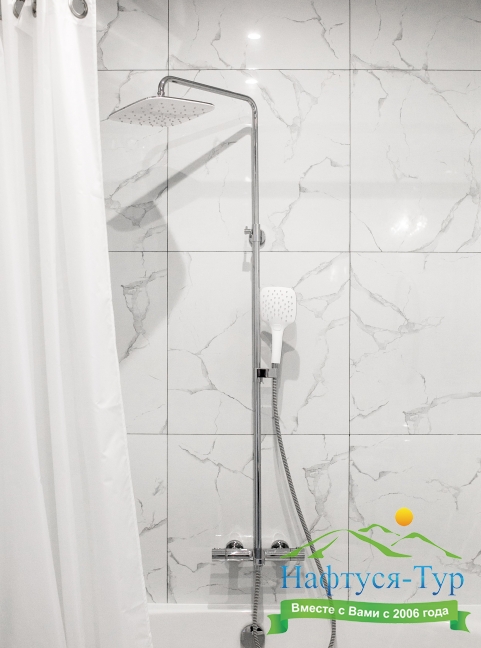 с душем или ванной, тапочки, туалетные принадлежности, фен