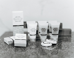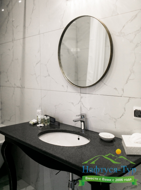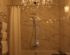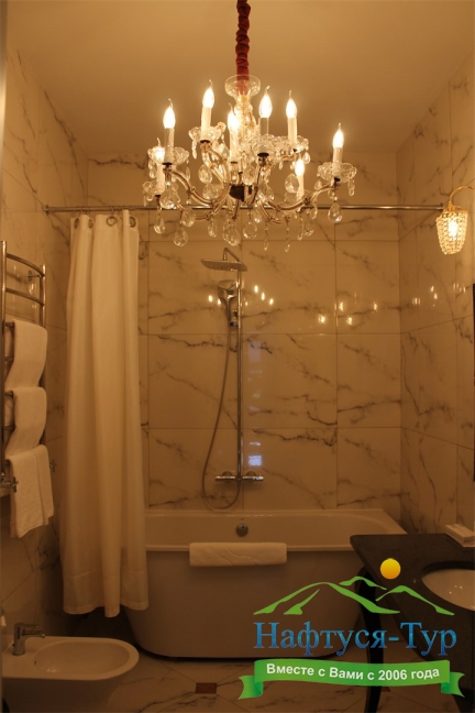 с ванной, тапочки, туалетные принадлежности, фен, халат