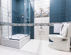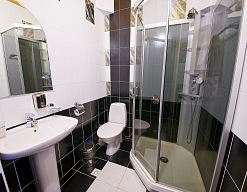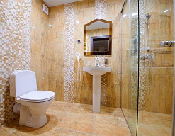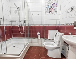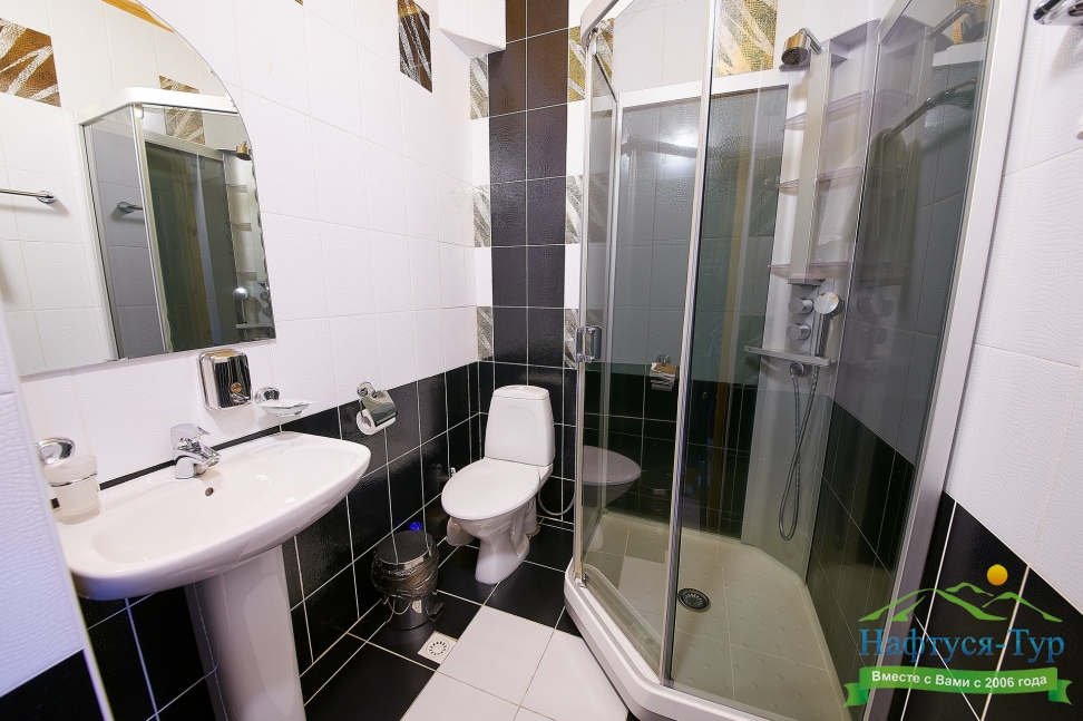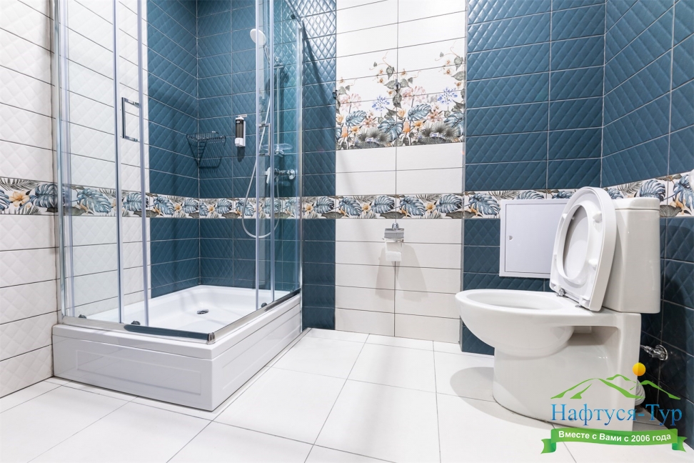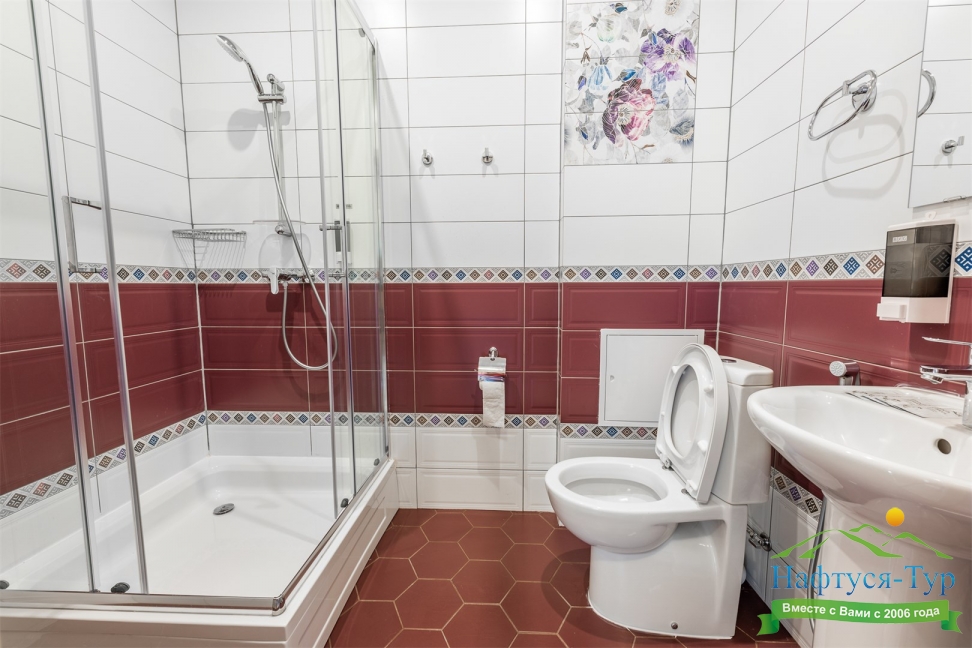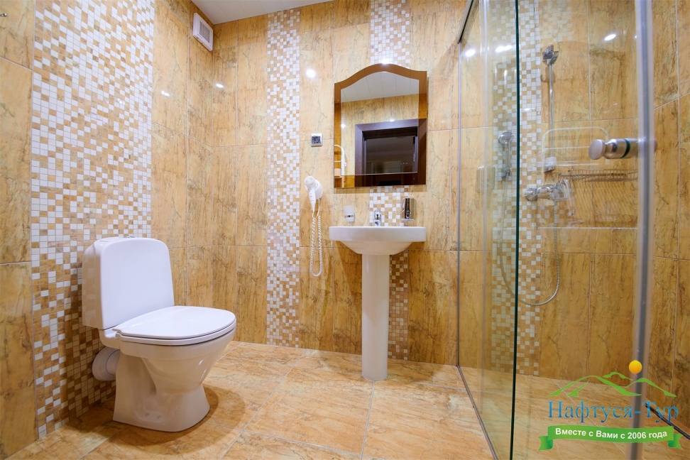 с душевой кабиной, тапочки, туалетные принадлежности, фен