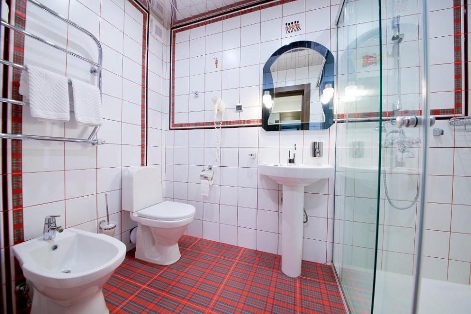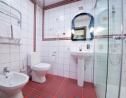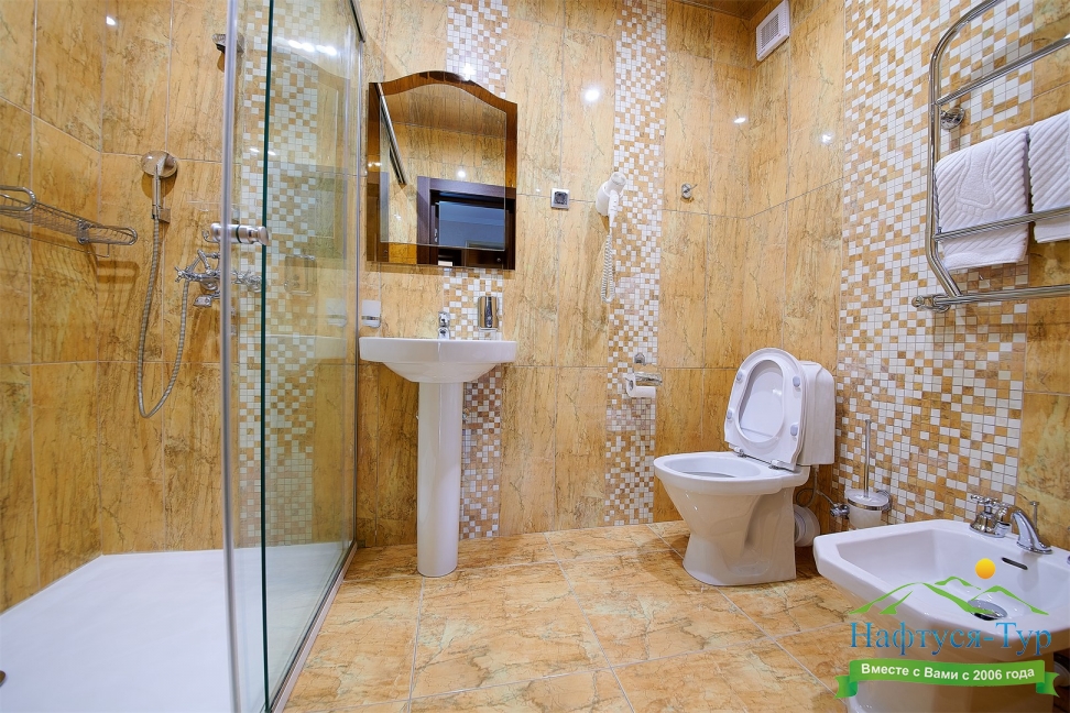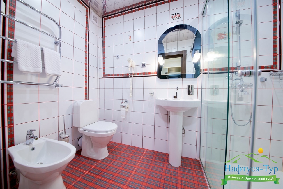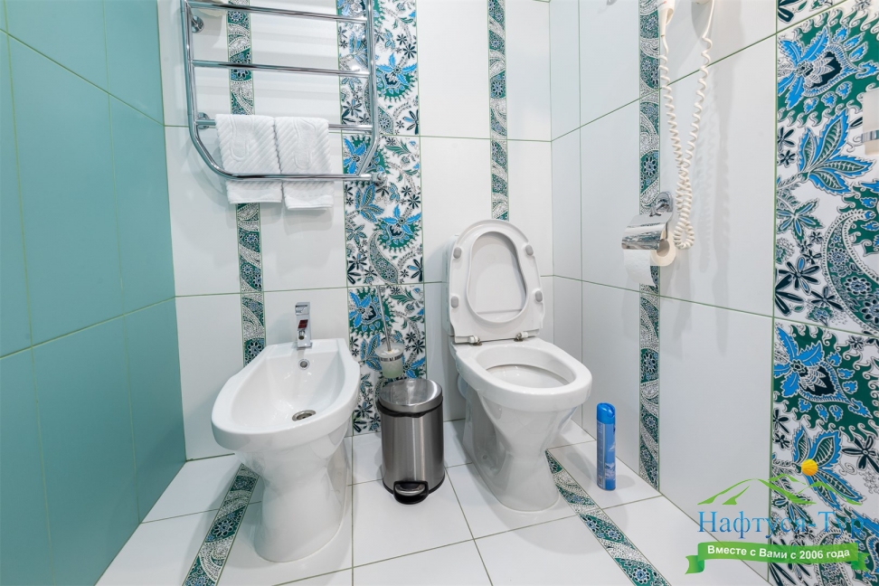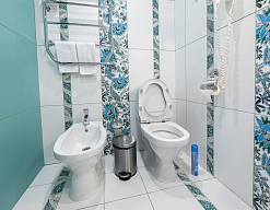 биде, с душем, тапочки, туалетные принадлежности, фен, халат