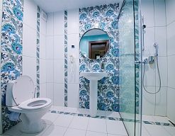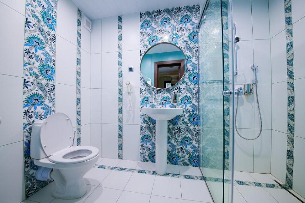 с душевой кабиной, туалетные принадлежности, фен