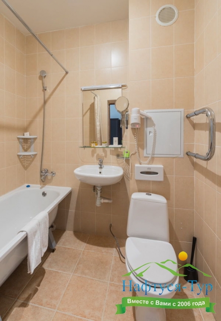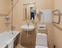 с ванной или душевой кабиной, туалетные принадлежности, фен