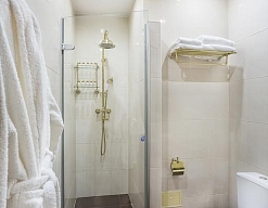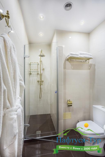 с душевой кабиной, тапочки, туалетные принадлежности, фен, халат