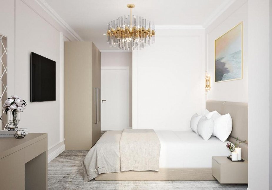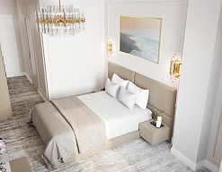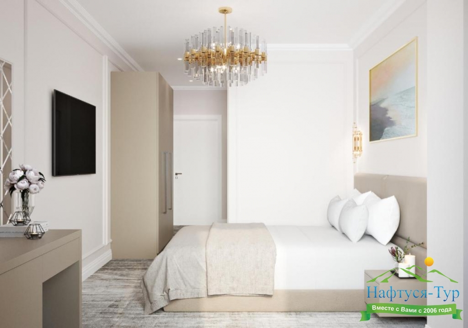 кровать двуспальная, прикроватные тумбочки, стол, стул, шкаф