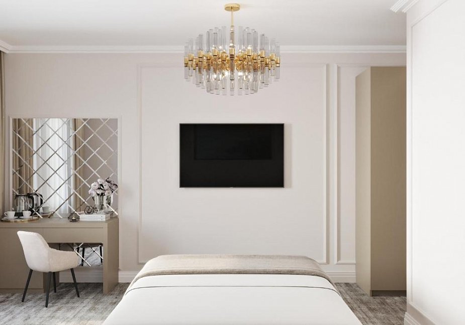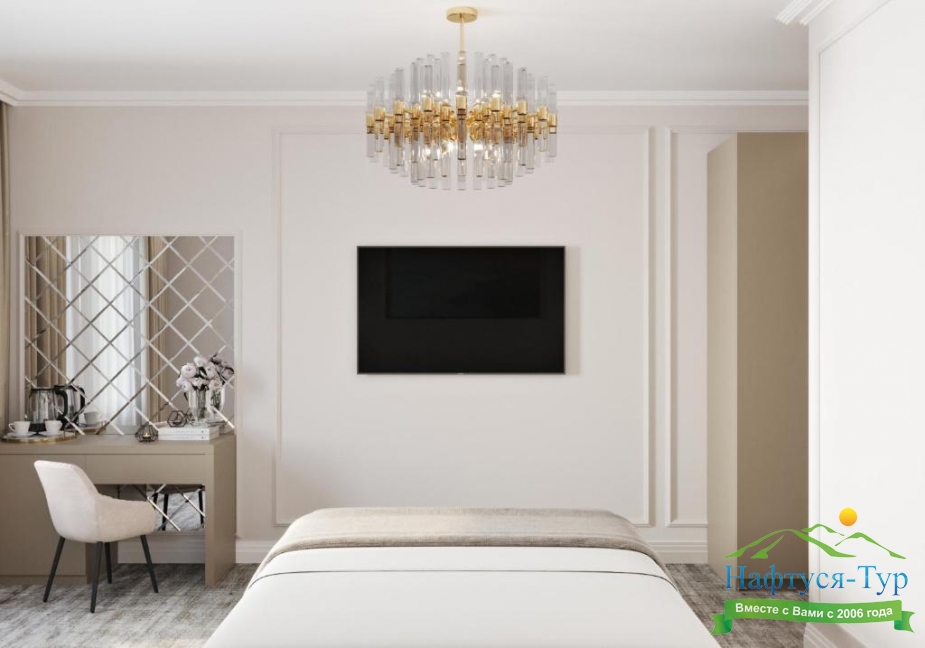 зеркало, кровать двуспальная, прикроватные тумбочки, стол, стул, шкаф