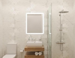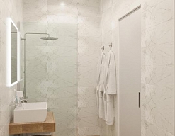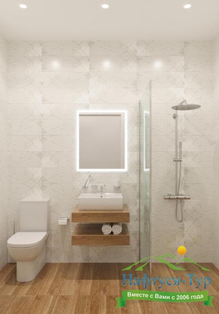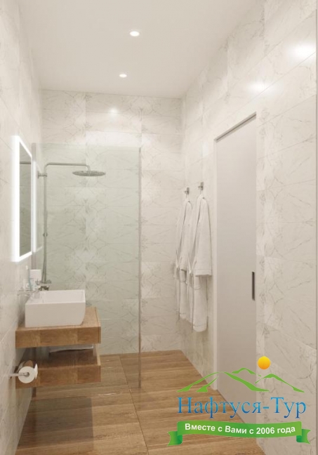 с душевой кабиной, тапочки, туалетные принадлежности, фен, халат