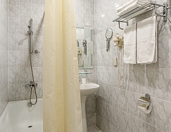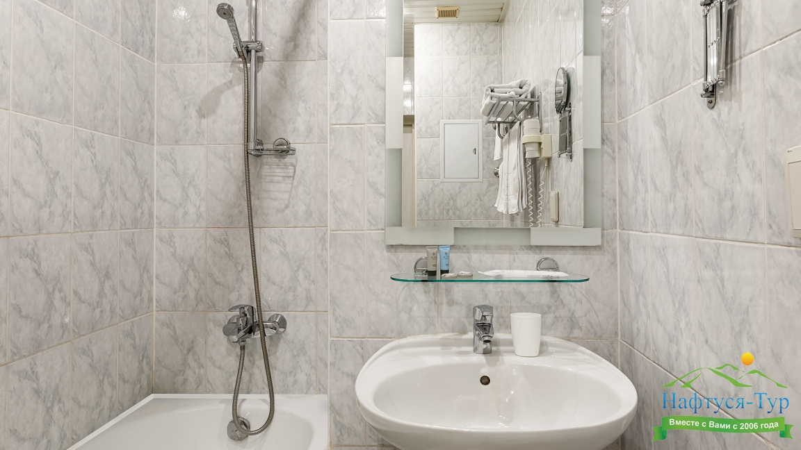 с ванной, тапочки, туалетные принадлежности, фен