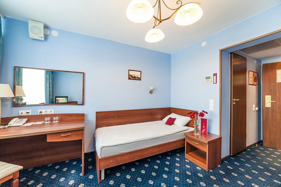 кровать односпальная, прикроватные тумбочки, стол, стулья, шкаф