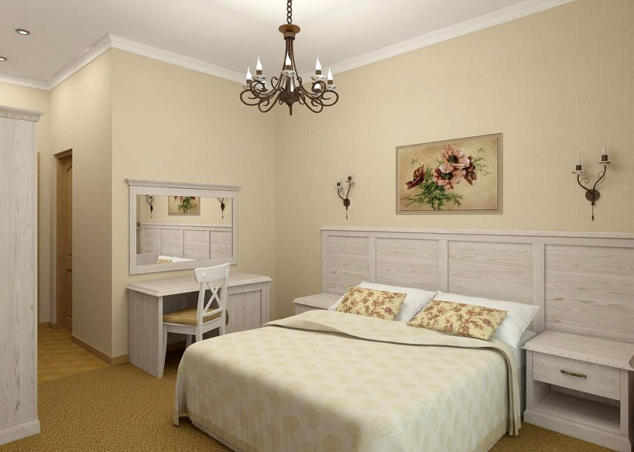 вешалка, зеркало, кровати односпальные /одна двуспальная кровать, прикроватные тумбочки, стол, стулья, шкаф