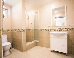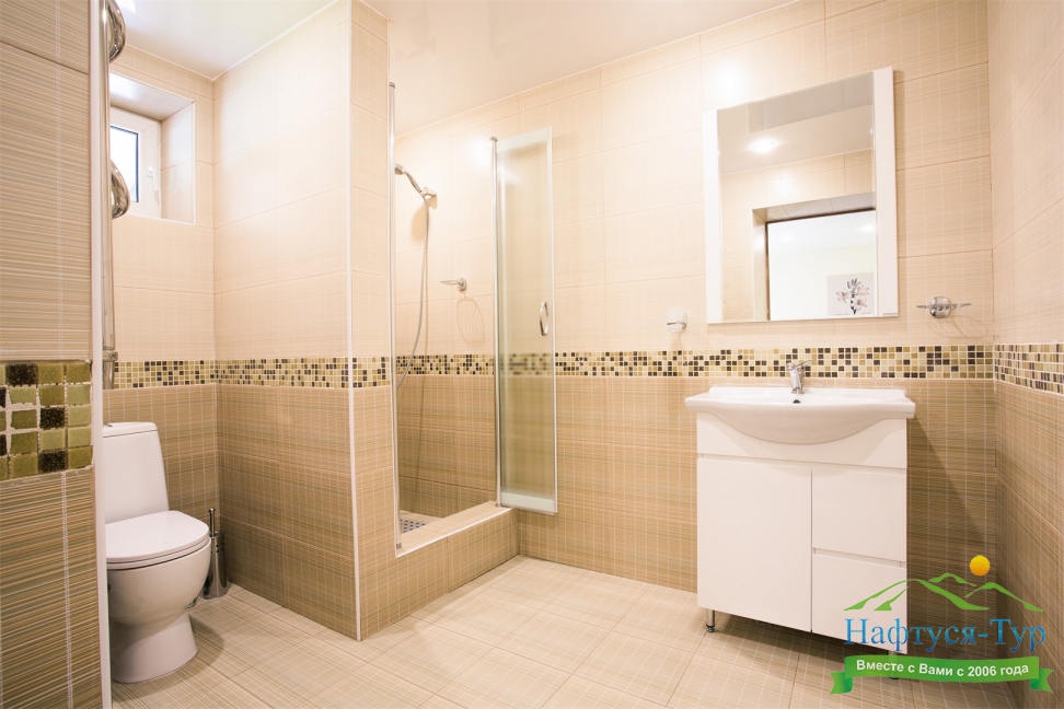 с душевой кабиной, тапочки, туалетные принадлежности, фен, халат