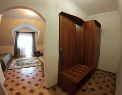 вешалка, диван, зеркало, кровать двуспальная, прикроватные тумбочки, стол, стулья, шкаф