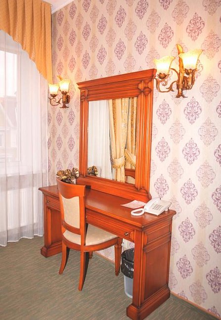 вешалка, зеркало, кровать двуспальная, прикроватные тумбочки, стол, стул, шкаф