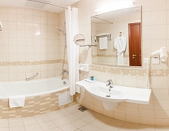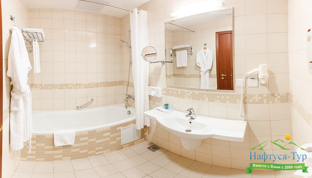 с ванной, тапочки, туалетные принадлежности, фен, халат