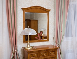 вешалка, диван, зеркало, кресло, кровать двуспальная, прикроватные тумбочки, стол, стулья, шкаф