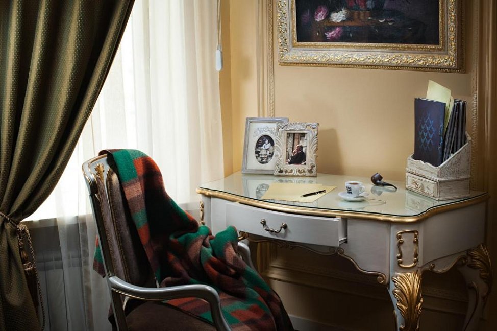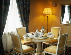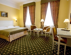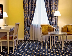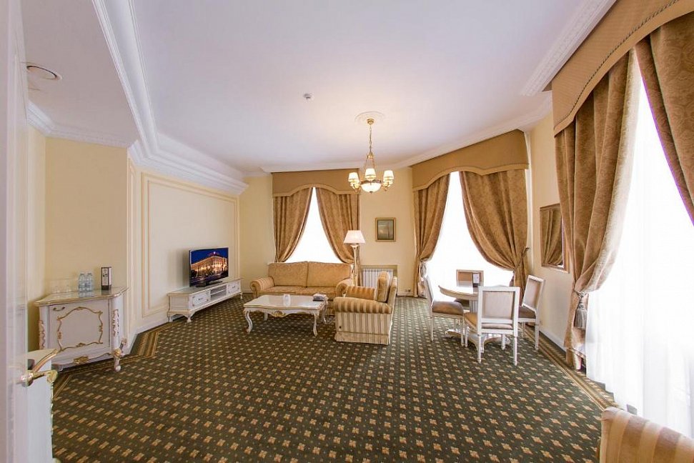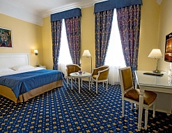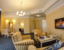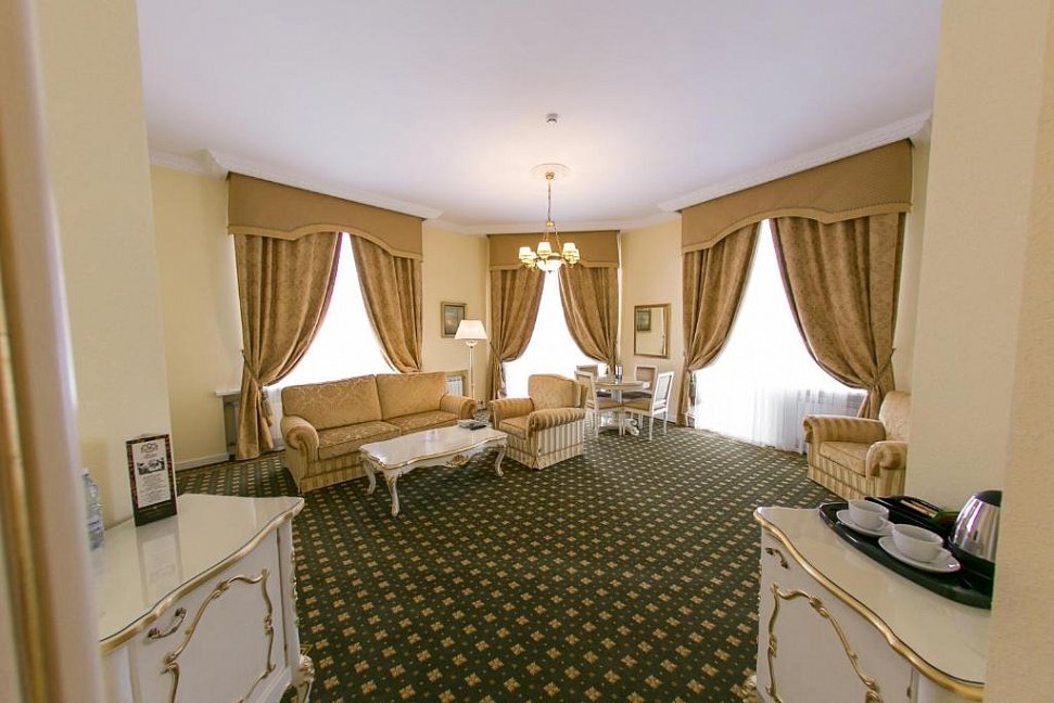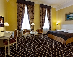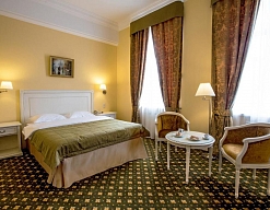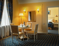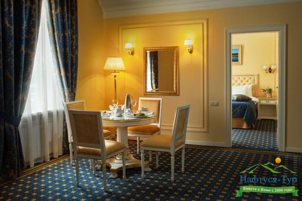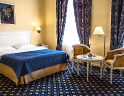 вешалка, зеркало, ковровое покрытие, кресла, кровать двуспальная, прикроватные тумбочки, стол, столик журнальный, стулья, тумба багажная, шкаф