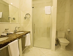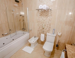 биде, с душевой кабиной, тапочки, туалетные принадлежности, фен, халат