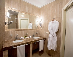 с ванной или душевой кабиной, тапочки, туалетные принадлежности, фен, халат