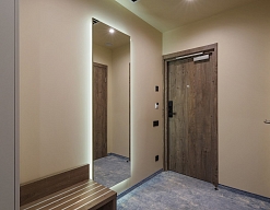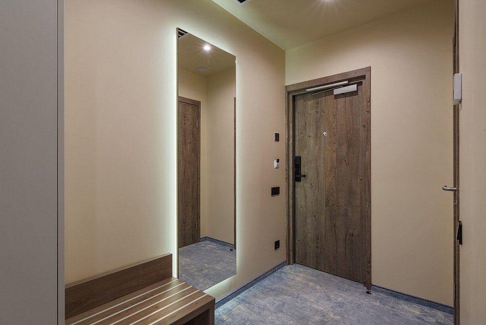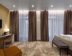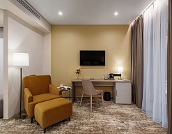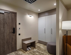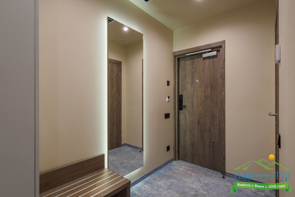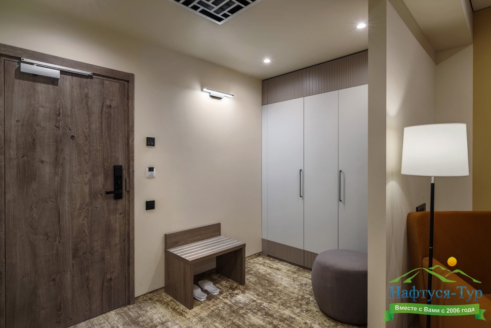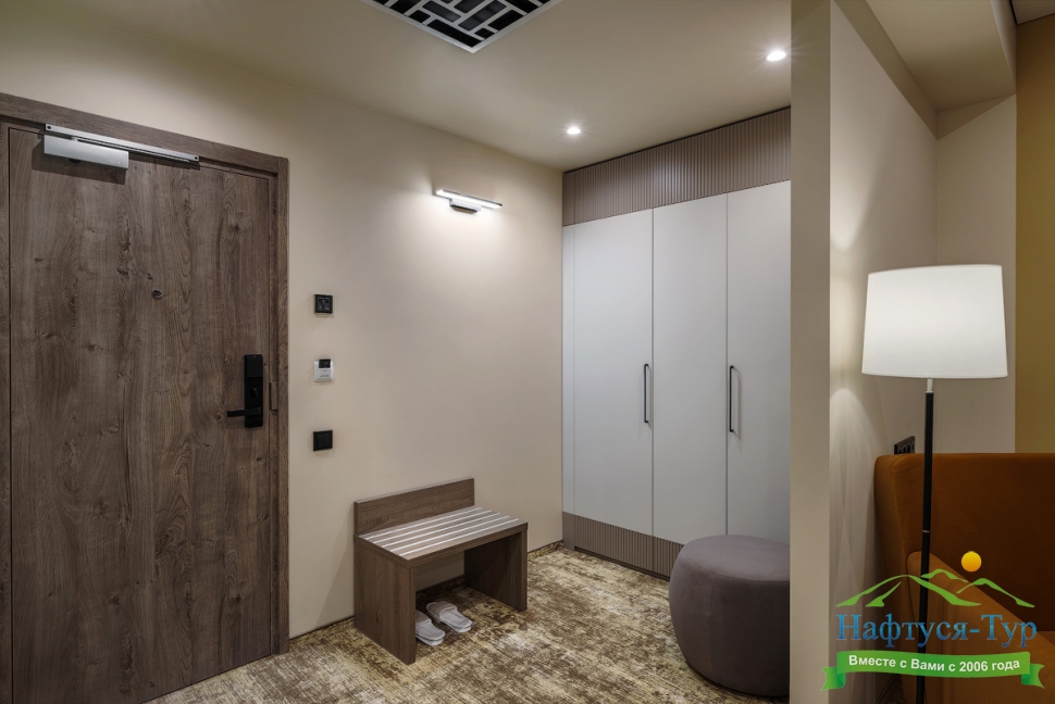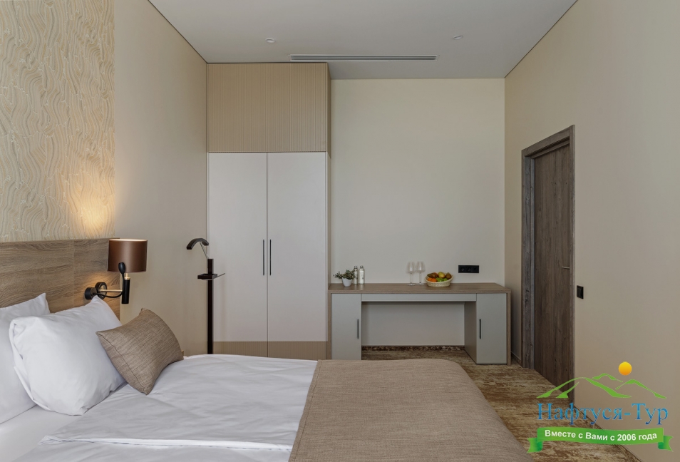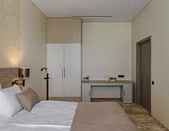 вешалка, зеркало, кресло, кровать двуспальная, прикроватные тумбочки, стол, тумба багажная, шкаф