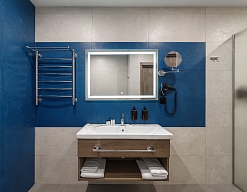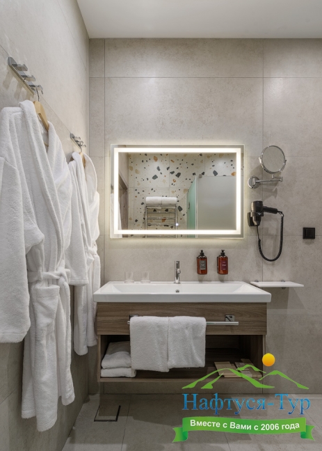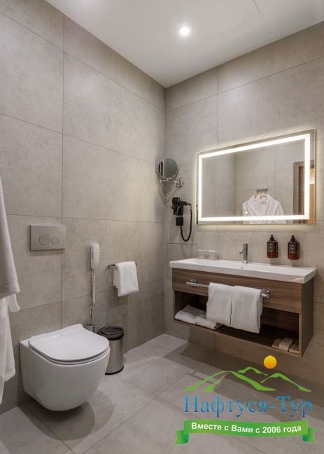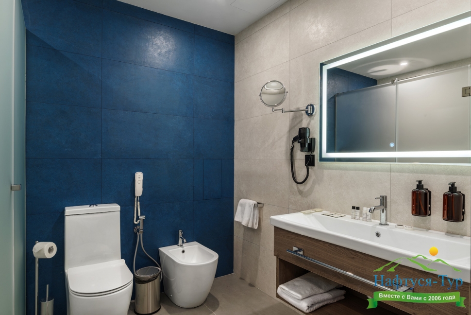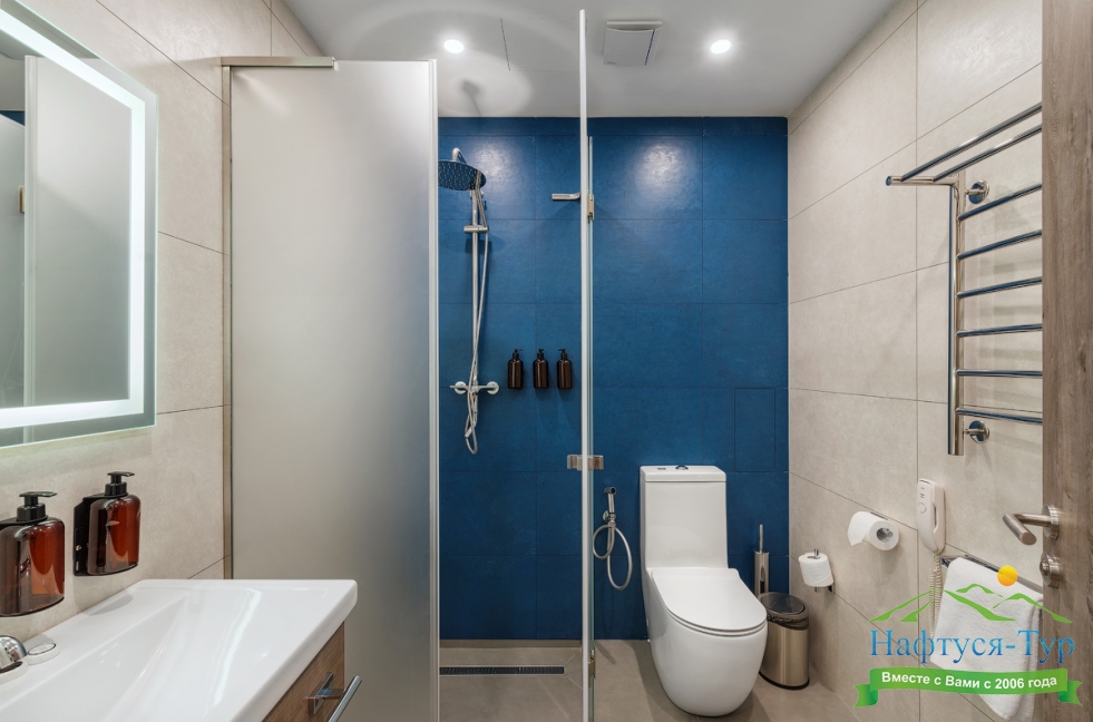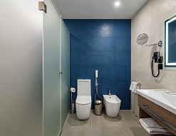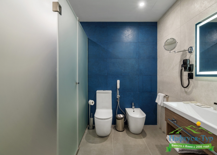 биде, с душевой кабиной, тапочки, туалетные принадлежности, фен, халат