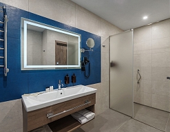 с душевой кабиной, тапочки, туалетные принадлежности, фен, халат